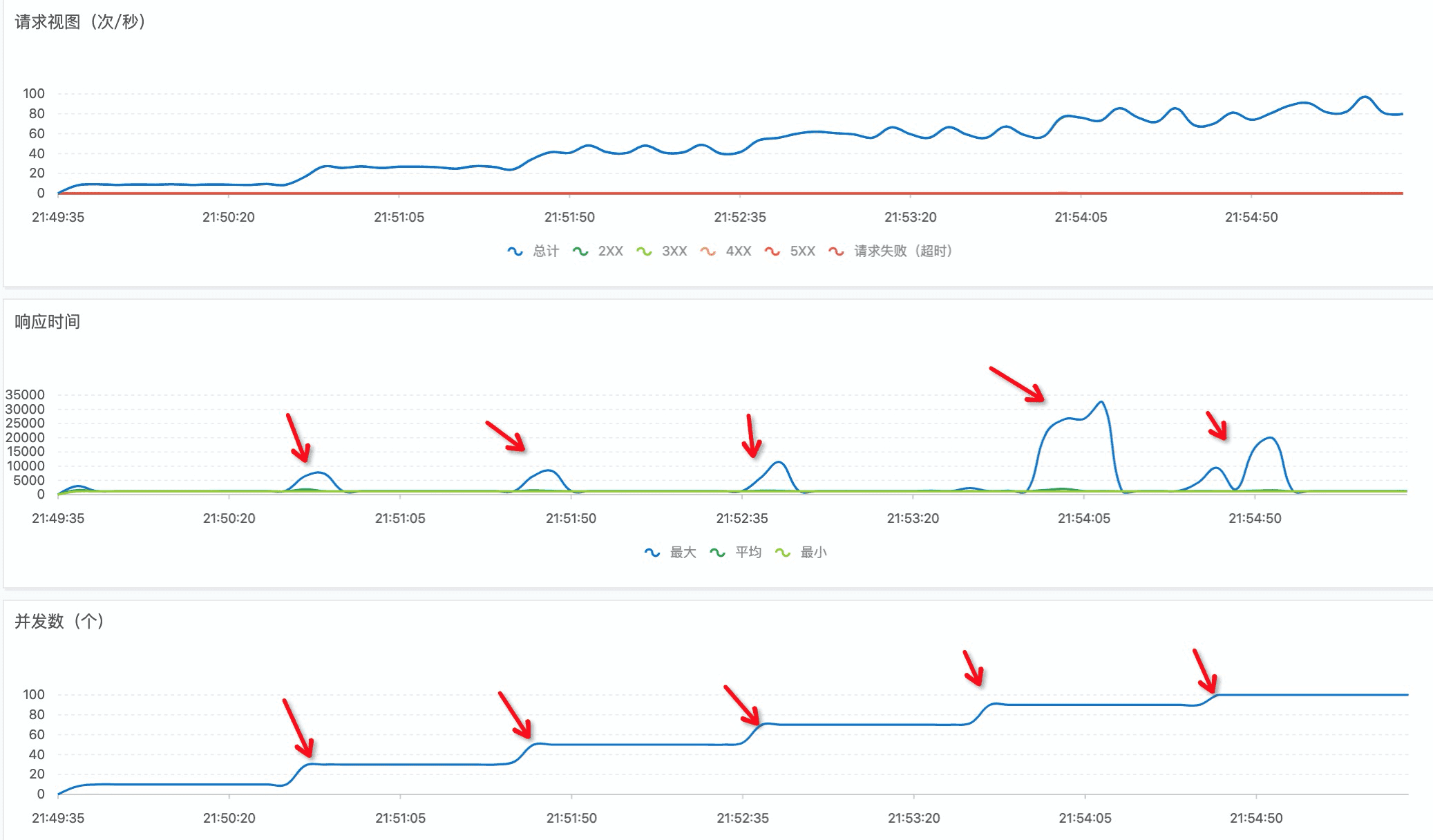 上面箭头所指的位置表示并发突然增加,函数自动扩容时会遇到一些冷启动,当扩容完毕,后续的请求就非常平稳了。