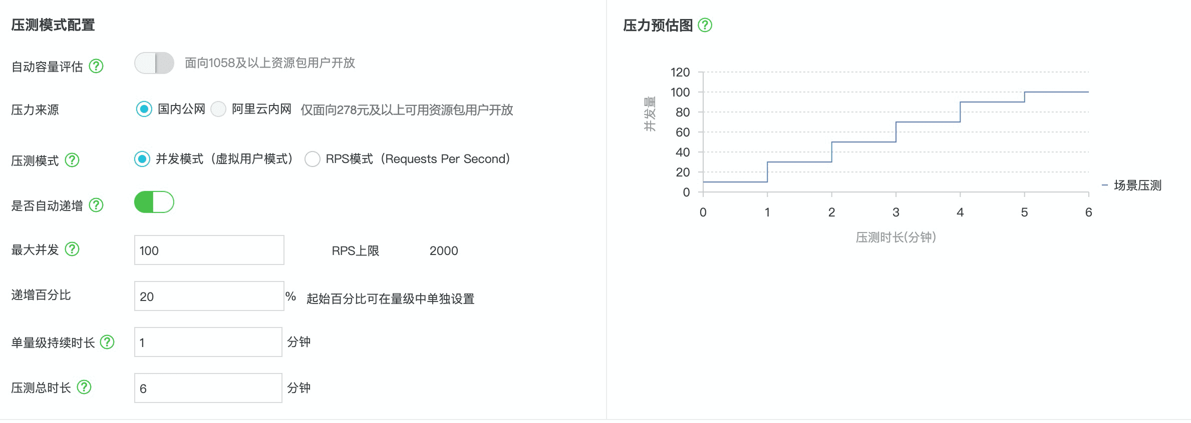 我们配置了 100 并发,测试 6 分钟,每分钟并发按照 20% 递增的规则进行压测。