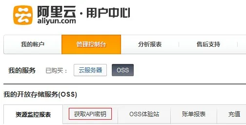 首先需要在阿里云中建立一个帐户。建立好帐户后,在管理控制台获取OSS的密钥。