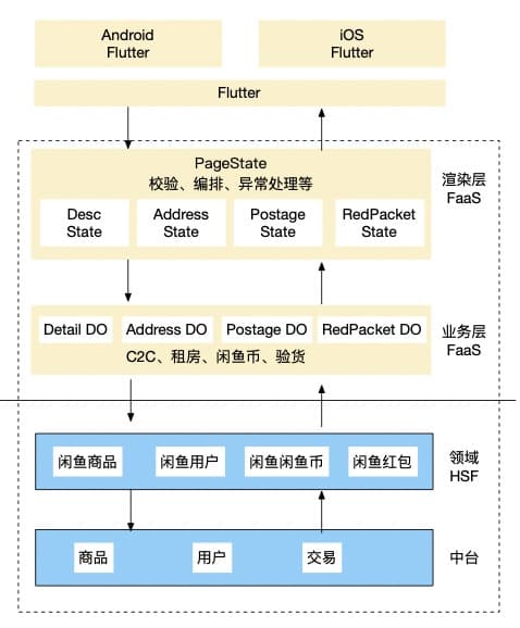 以下单业务为例,FaaS层通过6次HSF(RPC框架)调用获取领取数据组装而成。商品信息、收货地址与闲鱼币可以并行执行,红包、运费与验货担保可以并行执行,由于依赖商品信息与收货地址,两组任务需要串行执行。