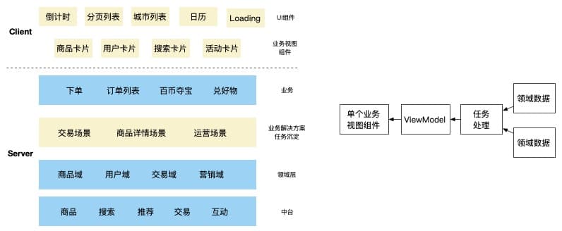 回顾一个完整的业务闭环,包括中台、领域层、业务层与渲染层。云端一体场景下FaaS侧更多的工作集中在业务层与渲染层,进行数据聚合、裁剪、字段映射和结构调整。
