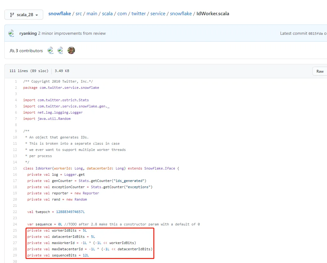 但是在实际源码实现中,Snowflake把10 bit的可配置的机器ID拆分为5 bit的Worker ID(这个可以理解为原来的机器ID)和5 bit的Data Center ID(数据中心ID),详情见IdWorker.scala: