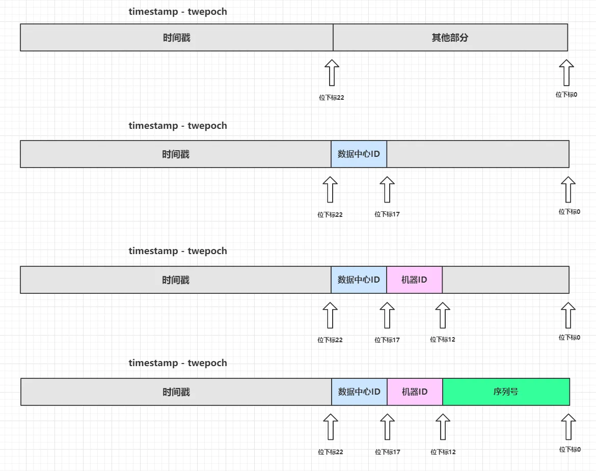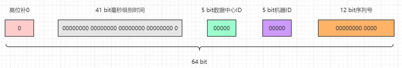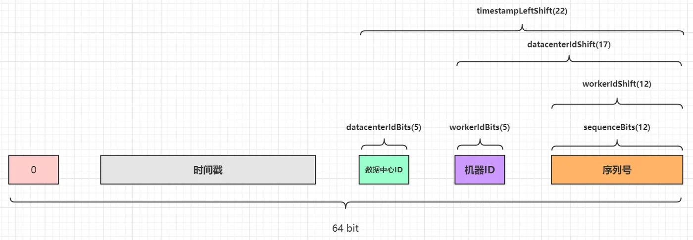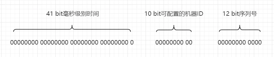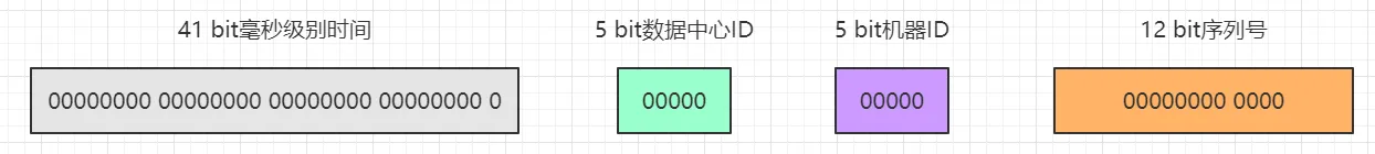 41 bit毫秒级别时间戳的取值范围是:[0, 2^41 - 1]=>0 ~ 2199023255551,一共2199023255552个数字。5 bit机器ID的取值范围是:[0, 2^5 - 1]=>0 ~ 31,一共32个数字。5 bit数据中心ID的取值范围是:[0, 2^5 - 1]=>0 ~ 31,一共32个数字。12 bit序列号的取值范围是:[0, 2^12 - 1]=>0 ~ 4095,一共4096个数字。