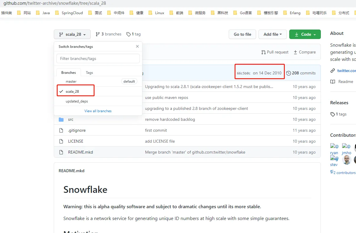 上图是Snowflake的Github仓库,master分支中的REAEMDE文件中提示:初始版本于2010年发布,基于Apache Thrift,早于Finagle(这里的Finagle是Twitter上用于RPC服务的构建模块)发布,而Twitter内部使用的Snowflake是一个完全重写的程序,在很大程度上依靠Twitter上的现有基础架构来运行。