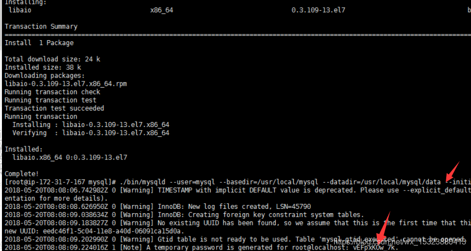 6.输入如下命令,初始化MySql,其中 vEFpxKOw_7k.就是MySQL第一次的随机密码(!!!!!!!!!!!!!!!!!!!!!!!!!!!!)