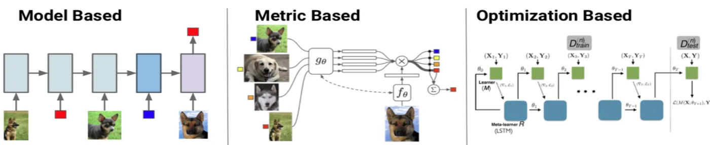 现有的few-shot learning 模型大致可分为三类,如图3所示: Mode Based,Metric Based 和Optimization Based。其中Model Based旨在通过模型结构的设计快速在少量样本上更新参数,直接建立输入x和预测值P的应设函数;Metric Based方法通过度量batch集中的样本和support 集中样本的距离,借助最近邻的思想完成分类;Optimization Based方法认为普通的梯度下降方法难以在few-shot场景下拟合,因此通过调整优化方法来完成小样本分类的任务。具体内容可以参考我们之前的 小样本学习综述。