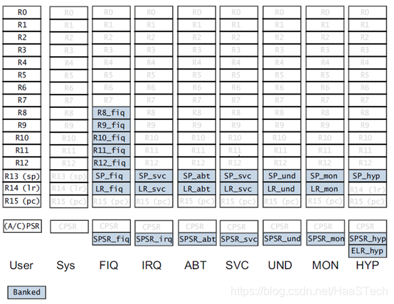 其中注意几点:每个模式下SP(R13)独立,PC只有一个,LR独立,SPSR自动保存着进入该模式前的CPSR。Fiq比较特殊,R8~R14都是独立的。