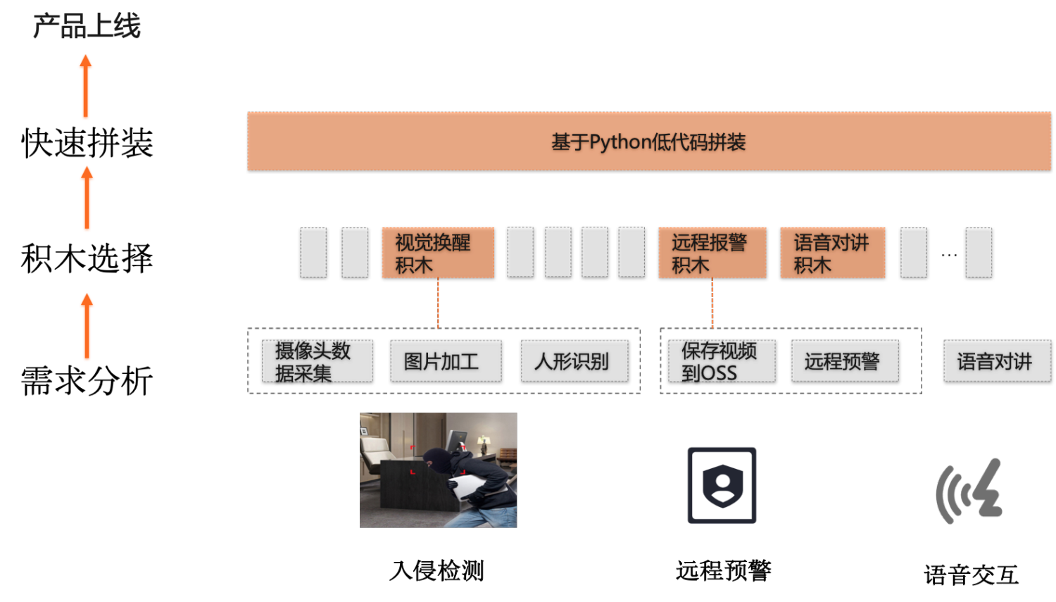 Python轻应用提供数据压缩,数据加密,图片预处理,端上AI预处理,语音唤醒,视觉唤醒等设备端数据处理能力,针对较大量的数据,可以先经过端上加工以后再上云,可以有效节省流量成本和云成本。例如安防场景中,可以在端上设定视觉唤醒词(例如 人形检测),视觉唤醒以后再将监控数据上云,并触发云端报警。例如身份证识别,在检测到生份证边缘以后,拍一张照片上传云端完成识别。