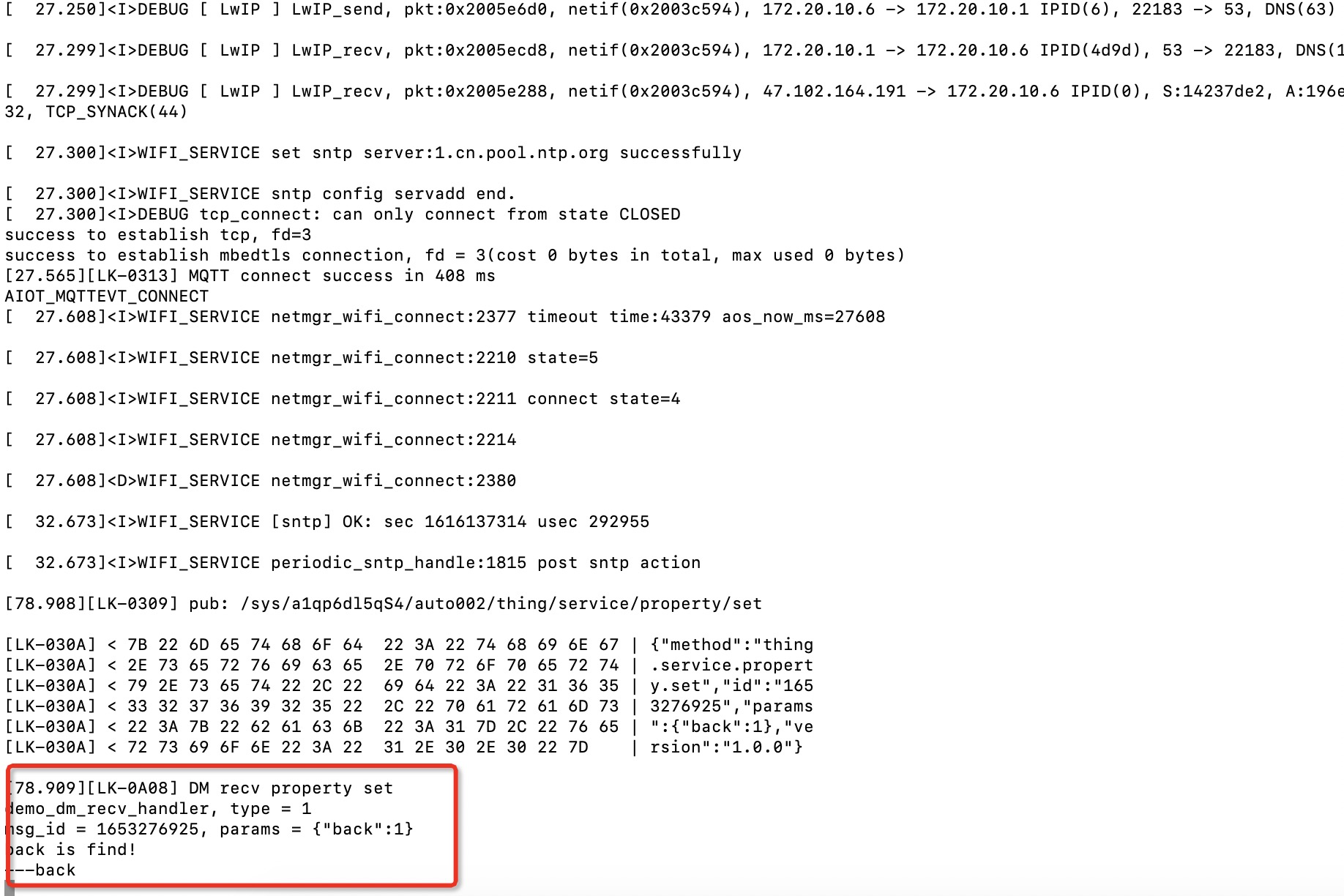 static void demo_dm_recv_handler(void *dm_handle, const aiot_dm_recv_t *recv, void *userdata) { uint8_t i; printf("demo_dm_recv_handler, type = %d\r\n", recv->type); switch (recv->type) { /* 云端下发的属性设置 */ case AIOT_DMRECV_PROPERTY_SET: { printf("msg_id = %ld, params = %.*s\r\n", (unsigned long)recv->data.property_set.msg_id, recv->data.property_set.params_len, recv->data.property_set.params); char *auto_temp[5]={"back","left","right","stop","front"}; cJSON *root = cJSON_Parse(recv->data.property_set.params); for(i = 0 ;i<5 ;i++){ cJSON *value = cJSON_GetObjectItem(root,auto_temp[i]); if (value != NULL && cJSON_IsNumber(value)) { printf("%s is find!\r\n",auto_temp[i]); break; } } switch(i){ case 0: back_ctl(); //后退 printf("---back\r\n"); break; case 1: left_ctl(); //左转 printf("---left\r\n"); break; case 2: right_ctl(); //右转 printf("---right\r\n"); break; case 3: stop_ctl(); //停止 printf("---stop\r\n"); break; case 4: front_ctl(); //前进 printf("---front\r\n"); break; default: break; } } break; .... default: break; } }