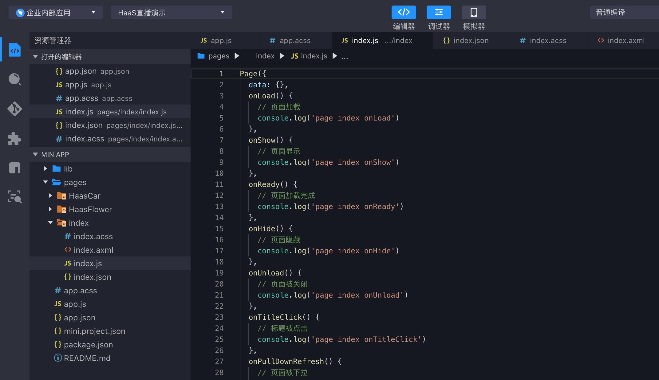 . ├─ lib (存放依赖库的文件夹,用户无需关心) │ ├─ @alicloud/pop-core ([https://github.com/aliyun/openapi-core-nodejs-sdk](https://github.com/aliyun/openapi-core-nodejs-sdk)) │ ├─ kitx │ └─ iot-packet.js (封装给用户的文件) ├─ pages (页面文件夹,用户在这里自定义页面,示例持续更新中) │ └─ index (首页 选择进入不同示例) │ ├─ index.axml │ ├─ index.js │ ├─ index.acss │ └─ index.json │ └─ HaasCar (示例1 HaaS小小蛮驴) │ ├─ HaasCar.axml (页面布局文件) │ ├─ HaasCar.js (控制逻辑,用户在这里定义交互行为) │ ├─ HaasCar.acss (页面样式) │ ├─ HaasCar.json (页面配置,用于配置页面标题等) │ └─ HaasCar.TSL.json (示例对应的TSL文件,用户可以在物联网平台上导入该文件生成物模型) │ └─ HaasFlower (示例2 HaaS养花,目录结构同 HaasCar) ├─ app.js (注册小程序,在这里进行全局参数配置,如 AccessKey) ├─ app.acss (小程序全局样式) ├─ app.json (小程序全局配置,可以在这里设置小程序打开的默认页面) └─ others