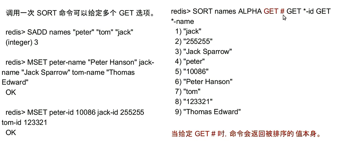 - [GET pattern]:可以通过get选项去获取指定pattern作为新key对应的值,get选项可以有多个。例如:127.0.0.1:6379sort watch:leto by severtity: get severtity:。 对于Hash的引用,采用->,例如:sort watch:leto get # get bug:*->priority。