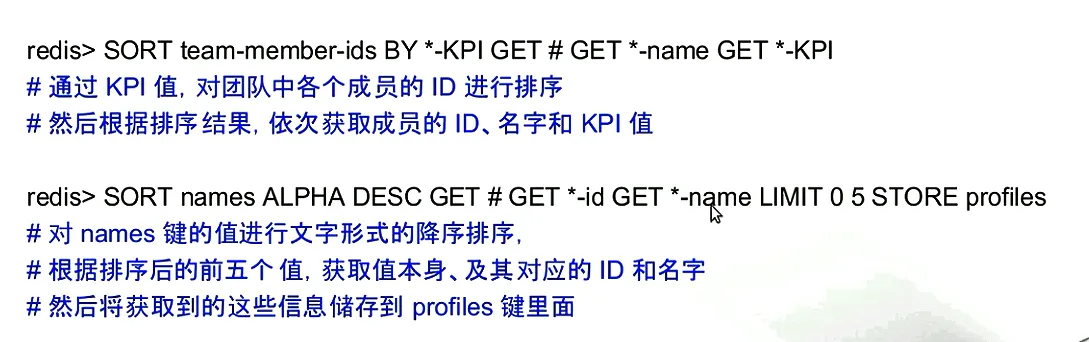 - [BY pattern] : 除了可以按集合元素自身值排序外,还可以将集合元素内容按照给定pattern组合成新的key,并按照新key中对应的内容进行排序。例如: