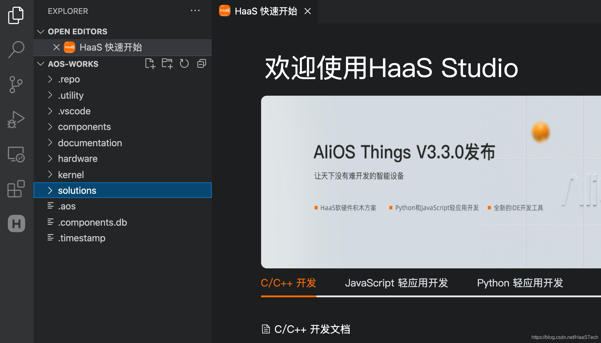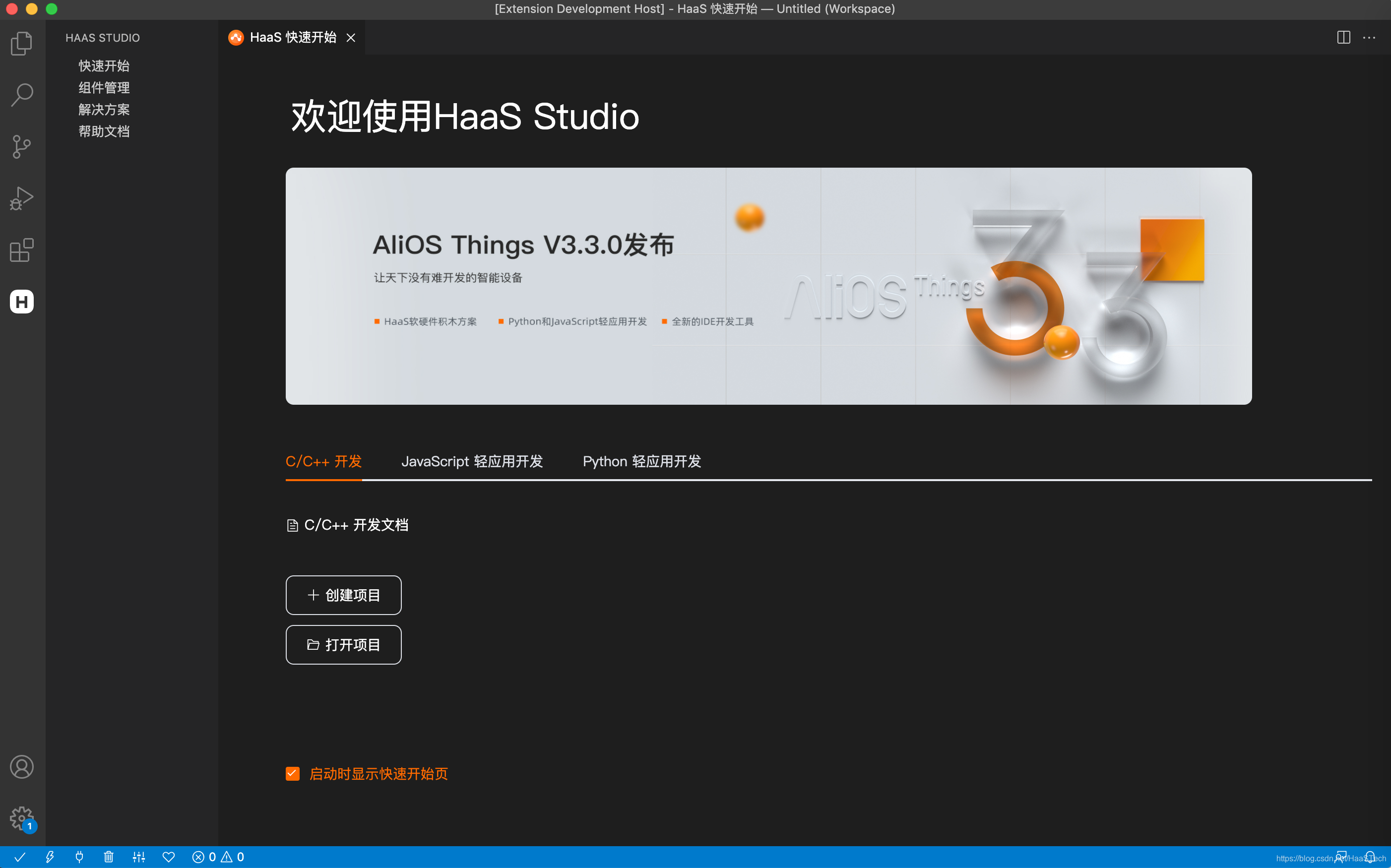 点击左侧H形图标,选择快速开始选项,打开HaaS快速开始页面。