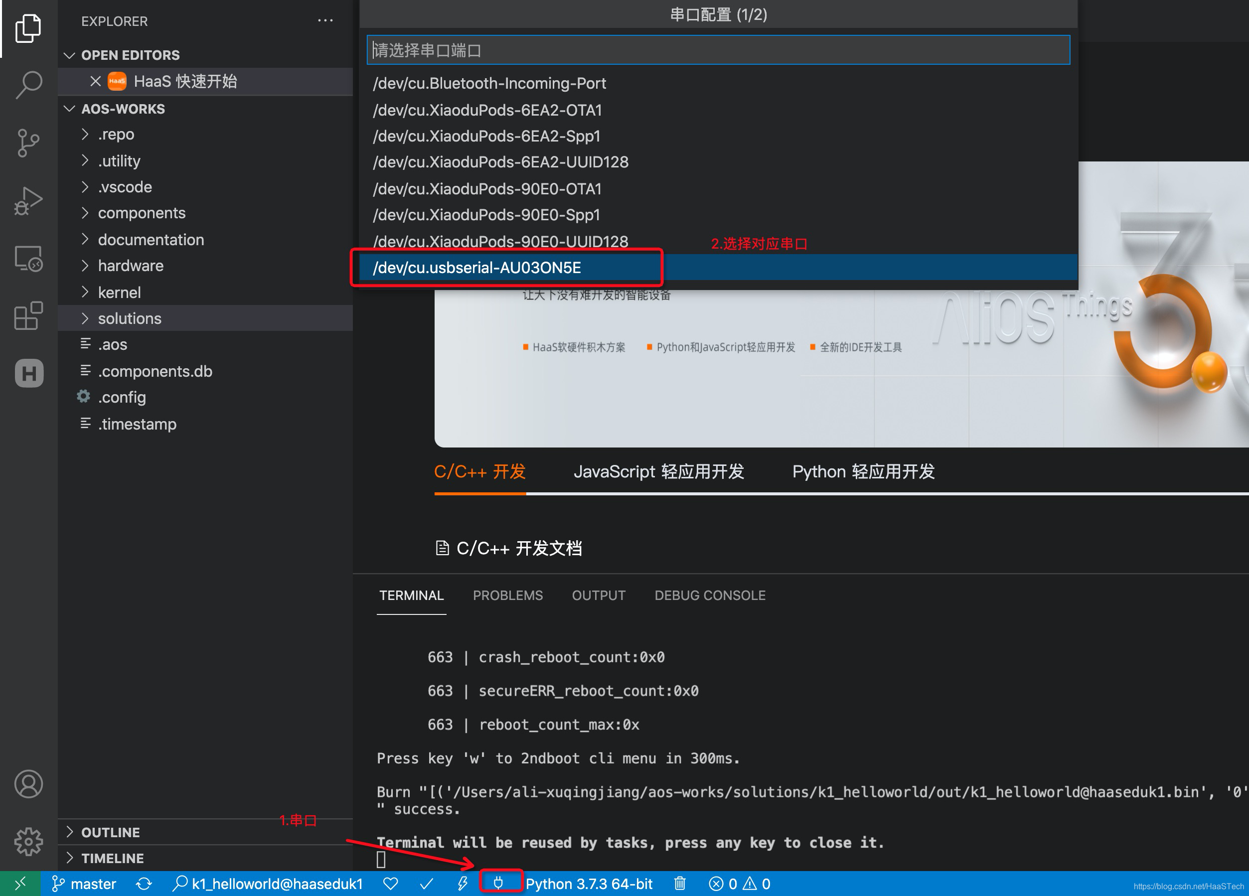 - 根据HaaS开发板的端口号,输入相对应的串口序号
