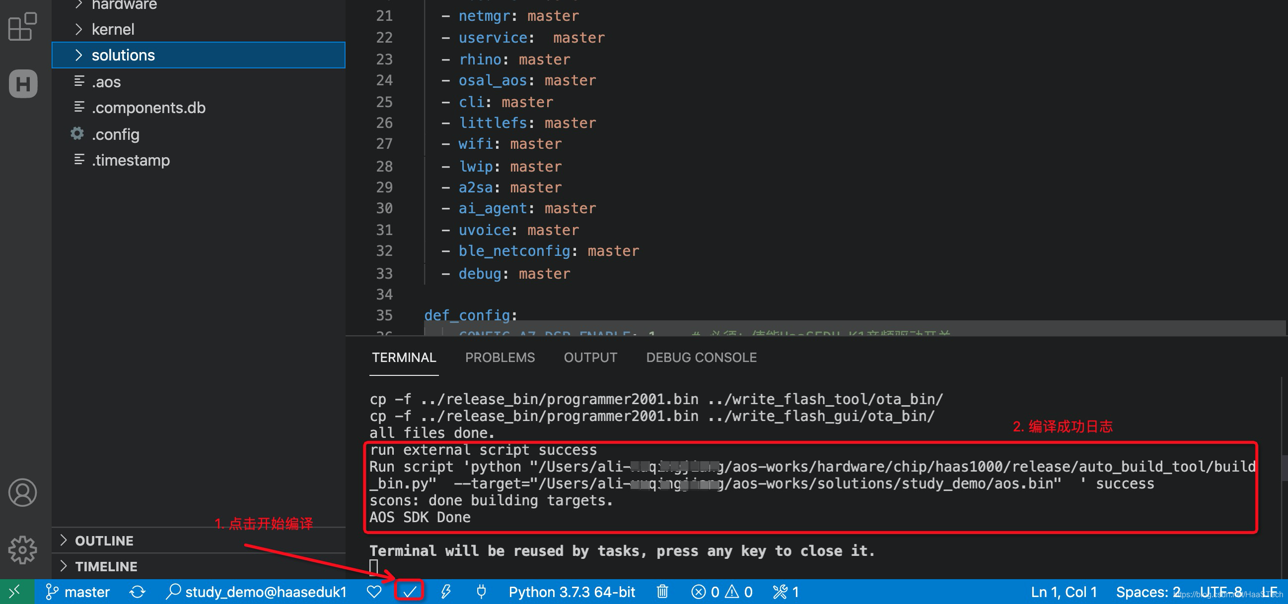 点击状态栏的编译图标,稍等片刻(由于需要安装编译器,第一次编译耗时稍久)就能看到编译成功的提示。