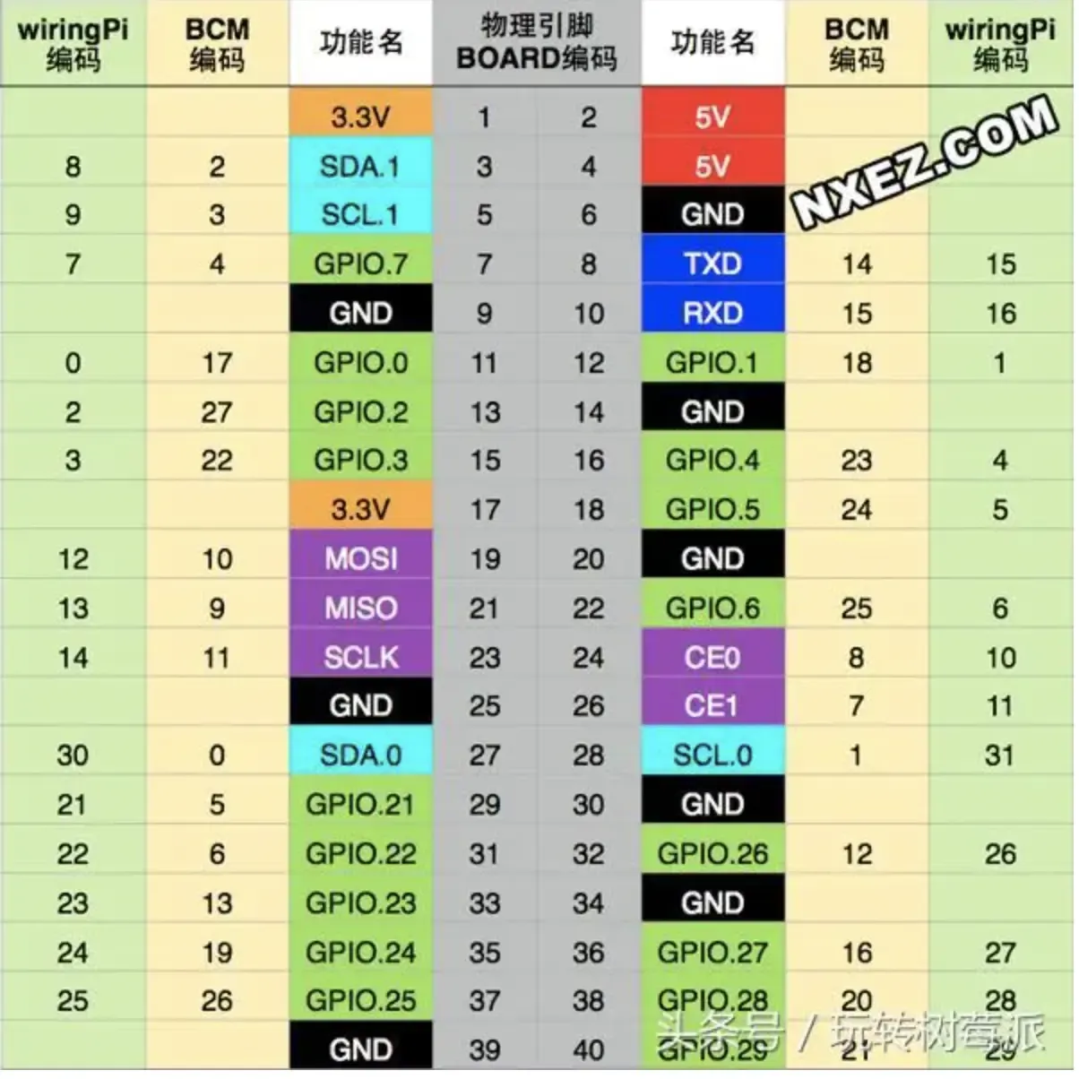 WiringPi编码对应的引脚号是在wiringPI库中所使用的,网上很容易找到其编码的相关资料,本系列博客我们不会使用到这个编码,这里不再赘述。