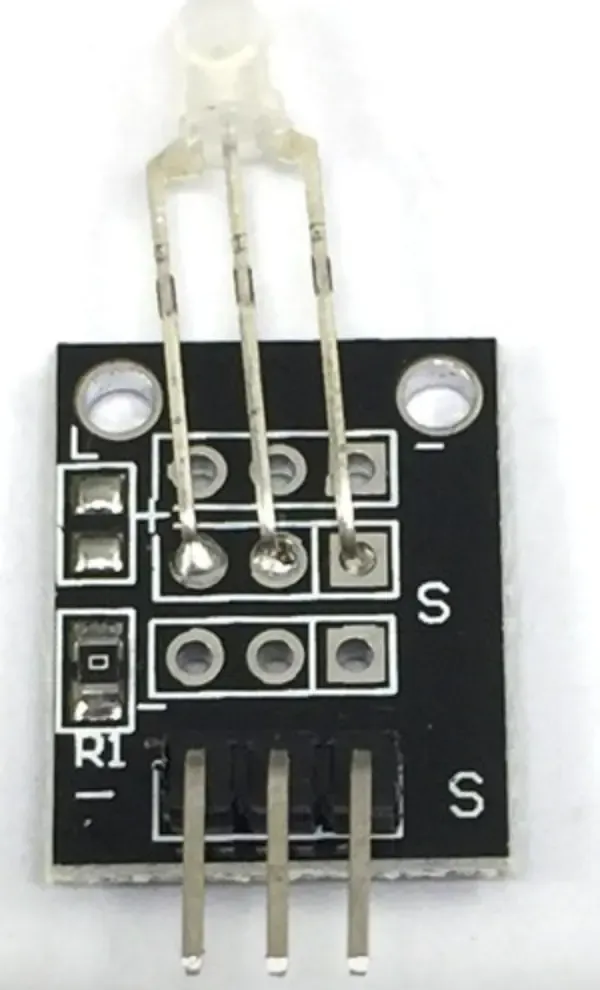 我们已经了解了双色LED等的工作原理,其有3个引脚,我们将引脚“-”接地,S端的引脚接扩展板G22用来控制红灯,中间的引脚接G27用来控制绿灯。接线情况如下图所示: