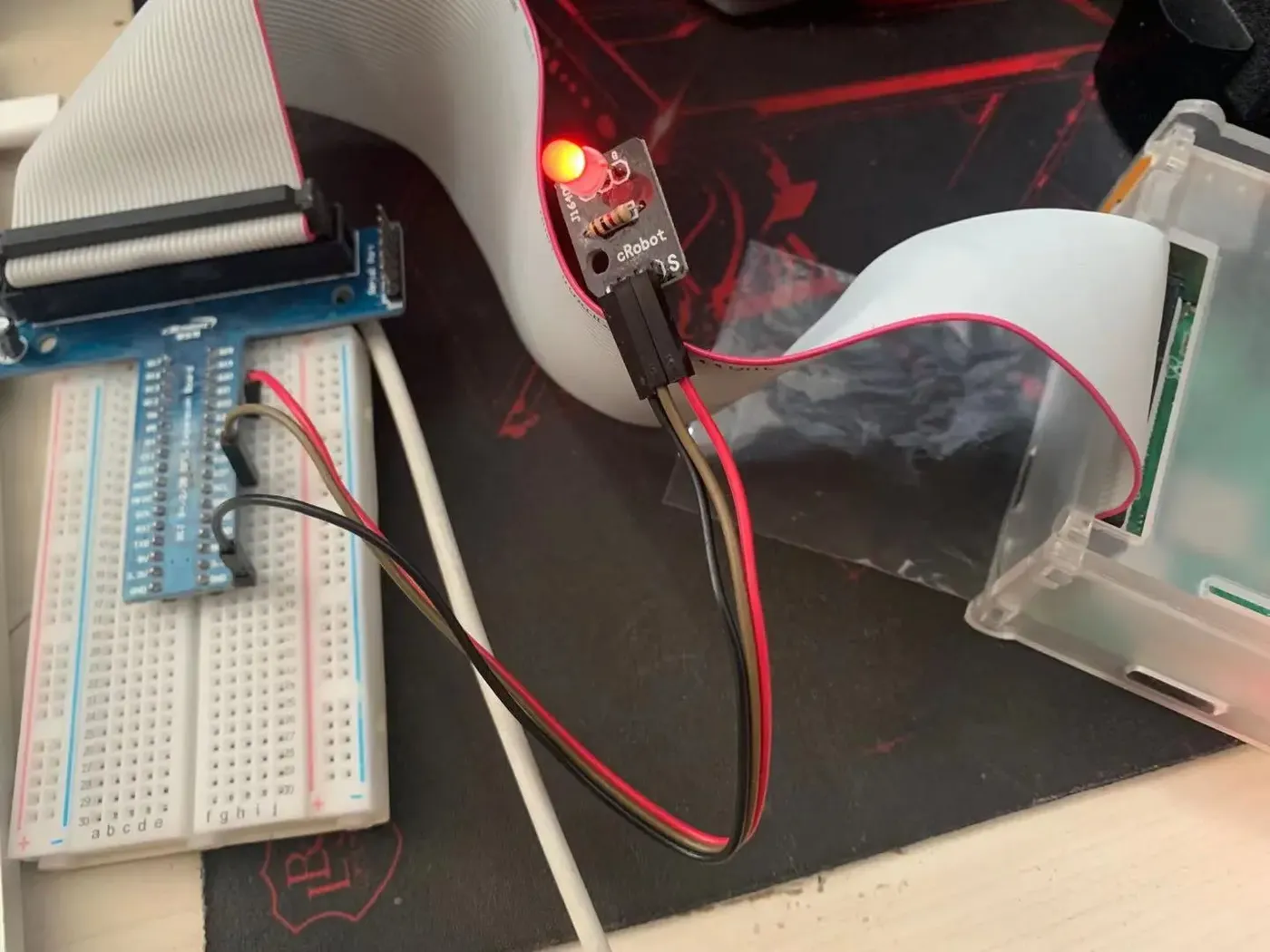在树莓派上运行上面的代码,你现在应该已经可以灵活的控制双色LED灯的开关和闪烁了,如下图所示: