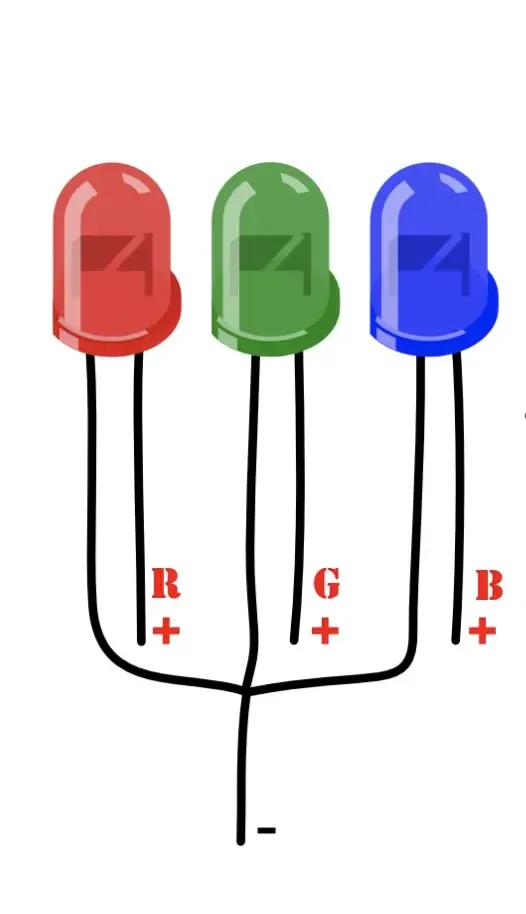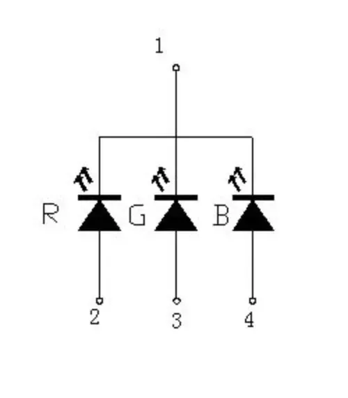 共阴型的LED灯,GND引脚是其公共的阴极,接线的时候我们需要将此引脚接地,另外3个引脚分别接3个GPIO来控制亮灯。下面两种图,非常直观的演示了此LED灯的工作原理: