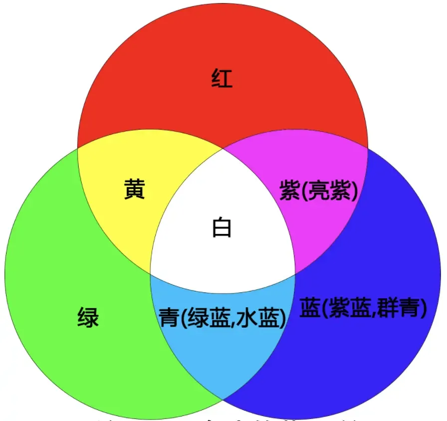 三原色本指色彩中不能再分解的三种基本颜色,在光学上,红、绿、蓝为最基本的三原色。三原色经过混合后,可以组成各式各样的颜色。例如将三原色等比混合后将能组成白色,将红色和绿色组合后会生成黄色,将红色和蓝色混合后会得到紫色等等。如下图所示: