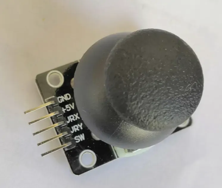 如果你顺利完成了上面的实验,先别急着庆祝,你会发现,和本系列前面几篇博客的内容较比,到目前为止我们并没有介绍新的知识,同时也没有做什么新颖的事情。的确如此,但是通过上面实验的练习,可以帮助你更深入的理解数模/模数转换的应用场景,并且让你能够更加灵活的对I2C总线与通用GPIO串口结合进行使用。下面我们要来做一些好玩的事情了,不知道你小时候是否有玩过“大把机”,这是一种摇杆游戏机,摇杆可以朝上下左右4个方向转动,也可以从中间按下。通常,上下左右用来控制游戏人物的行动方向,按下用来进行人物跳跃。现在,我们要来做一个简单的游戏,为树莓派连接操纵杆,控制游戏程序页面上圆球的行为,其中方向控制圆球的移动,按下操纵杆则使圆球变色。