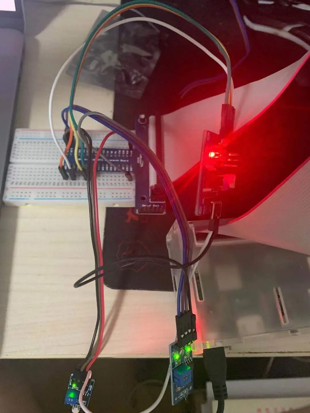和之前相比,我们这次直接在树莓派上连接了3个元件,连线也复杂了很多,只要按照上面的表格,注意引脚的正确即可。
