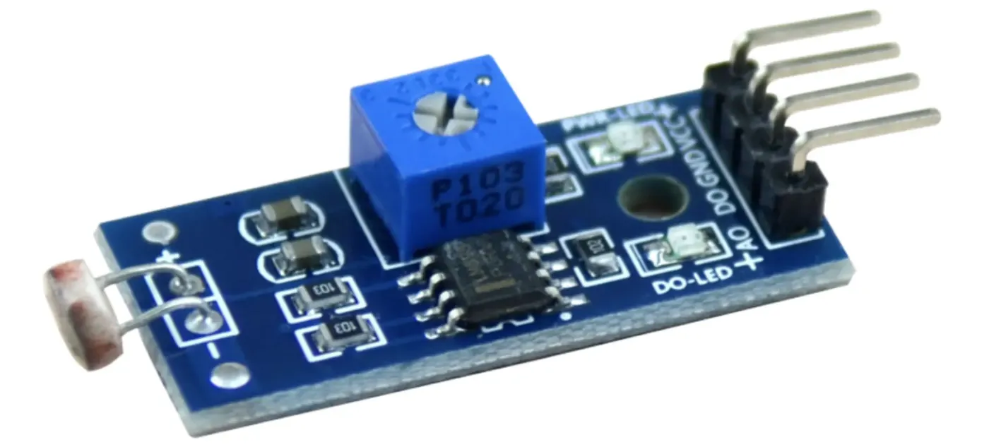 光敏传感器能够感应光纤的明暗变化,其实现此功能的核心在于光敏电阻,只做光敏电阻的常用材料有硫化镉、硫化铝等。这些材料在特定波长的光波照射下,其阻值会产生明显的变化。本次实验,我们使用的光敏传感器模块如下图所示: