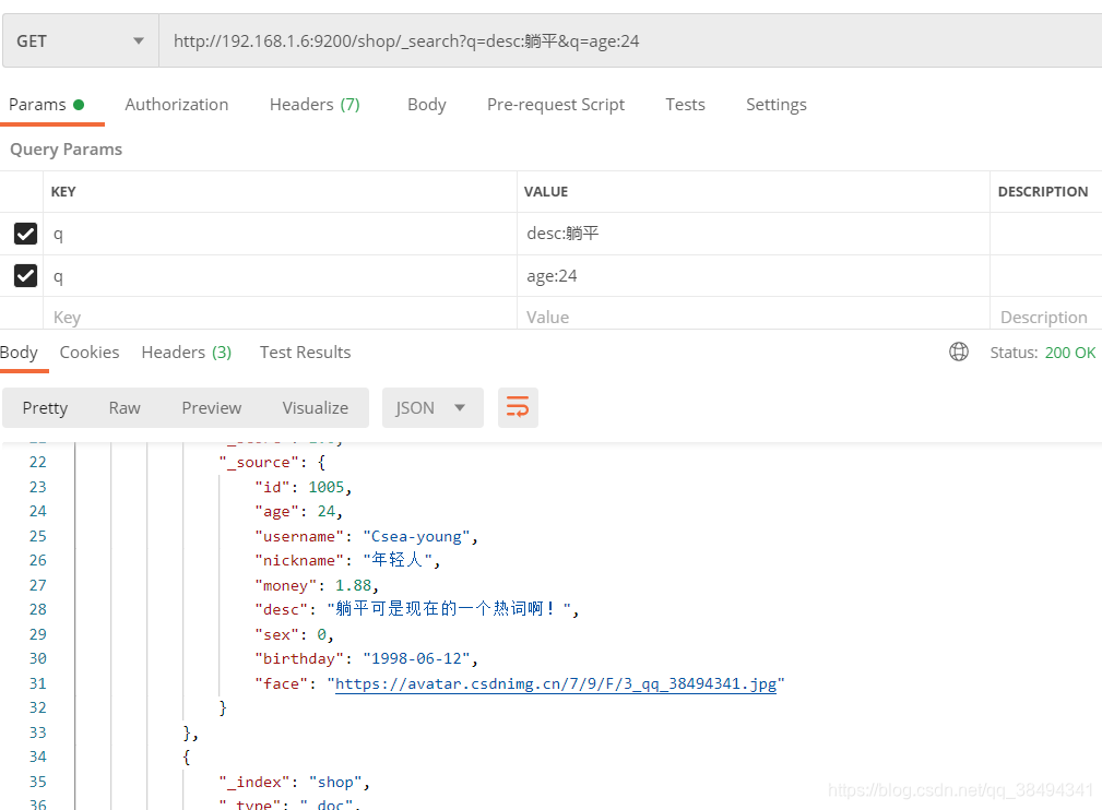 Get请求:http://{IP}:{port}/{索引名称}/_search?q={字段field}:{搜索内容}&q={字段field}:{搜索内容}