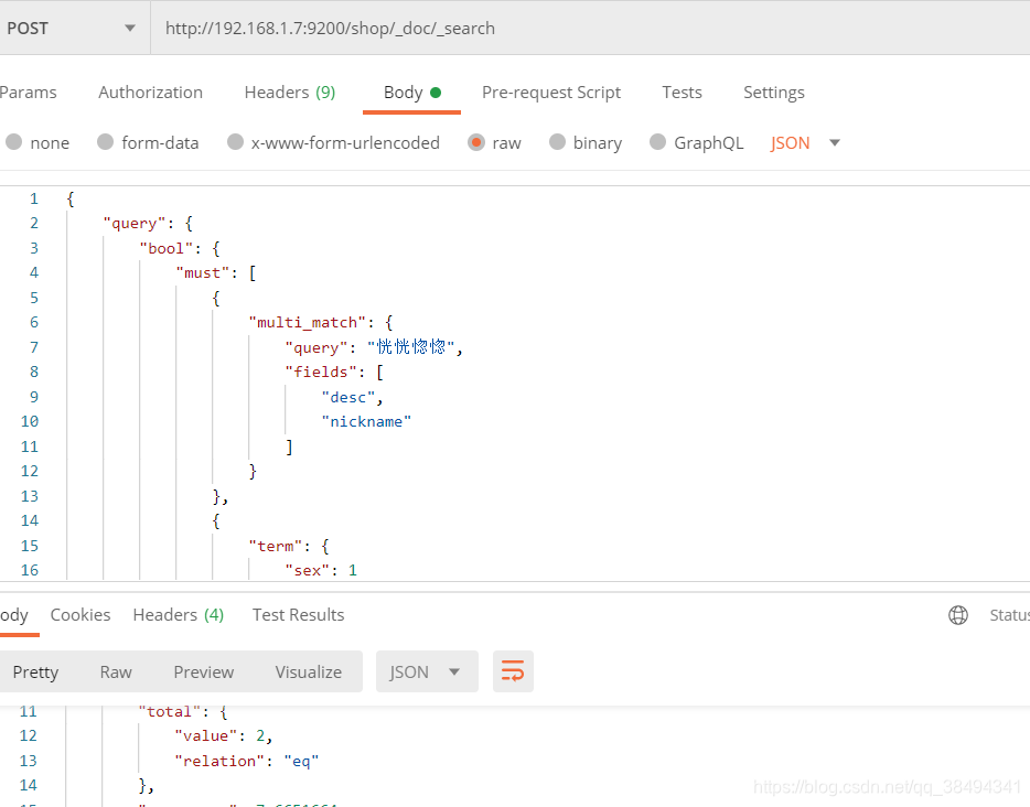 查询desc、nickname字段包含恍恍惚惚分词,并且sex为1的数据