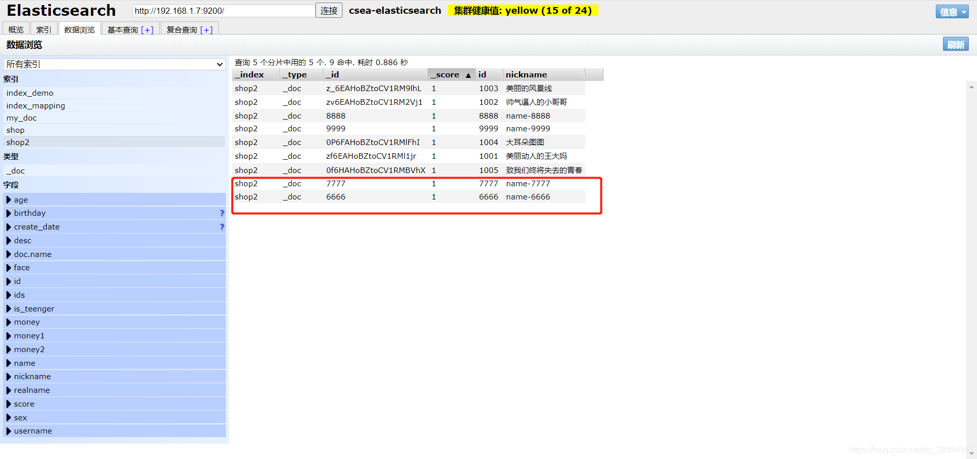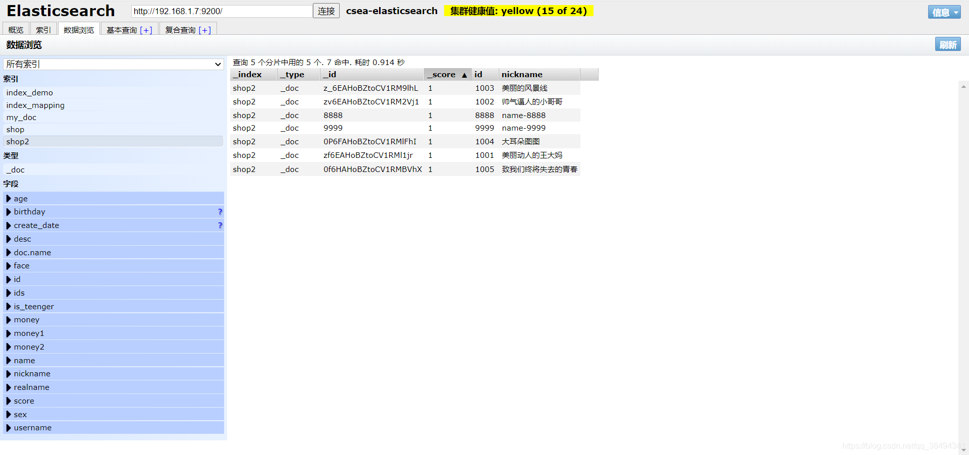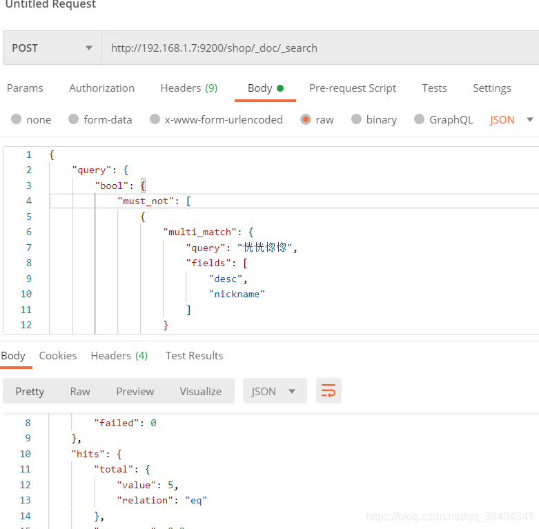 当改为must_not之后,查询结果就只有5条了,把不满足条件的数据全部查询出来,就跟should查询的数据量相加就是数据总量。