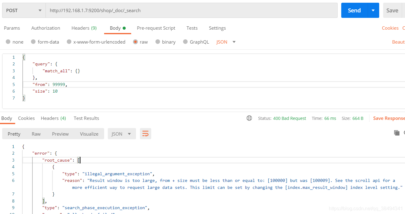 当ES的from达到9999,size为10时,ES自己做了一层校验,来进行提示。以免我们分页太深,对性能造成影响。