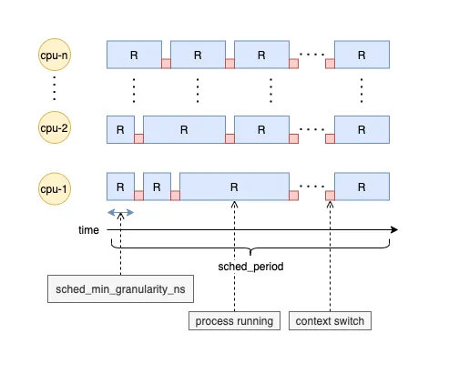 最小粒度时间:kernel.sched_min_granularity_ns 通过修改 kernel.sched_min_granularity_ns,可以影响 CFS 调度周期(sched period)的时间长短。例如:设置kernel.sched_min_granularity_ns = m,当系统中存在大量可运行进程时,m 越大,CFS 调度周期就越长。 如图 1 所示,每个进程都能够在 CPU 上运行且时间各有长短,sched_min_granularity_ns 保证了每个进程的最小运行时间(优先级相同的情况下),sched_min_granularity_ns 越大每个进程单次可运行的时间就越长。