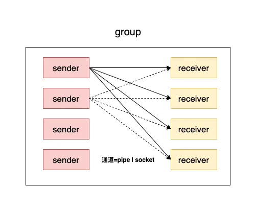 同一个 group 中的sender 和 receiver 有两种方式进行通信:pipe 和 local socket(一次测试中只能都是 pipe 或者 socket),不同 group 之间的线程没有交互关系。