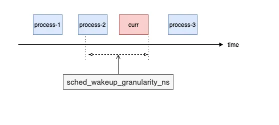 唤醒抢占粒度:kernel.sched_wakeup_granularity_ns kernel.sched_wakeup_granularity_ns 保证了重新唤醒的进程不会频繁抢占正在运行的进程,kernel.sched_wakeup_granularity_ns 越大,唤醒进程进行抢占的频率就越小。 如图 2 所示,有 process-{1,2,3} 三个进程被唤醒,因为 process-3 的运行时间大于 curr(正在 CPU 上运行的进程)无法抢占运行,而 process-2 运行时间小于 curr 但其差值小于 sched_wakeup_granularity_ns 也无法抢占运行,只有 process-1 能够抢占 curr 运行,因此 sched_wakeup_granularity_ns 越小,进程被唤醒后的响应时间就越快(等待运行时间越短)。