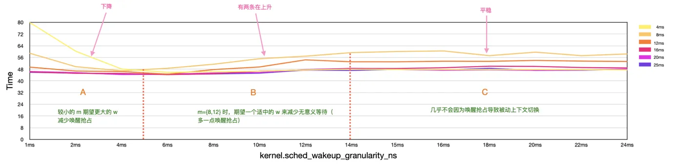 在区域B中,中等大小的 m(8ms/12ms)进程还是存在较多“被动上下文切换”,并且其中的进程已经处理了相当一部分数据期望对端进程能够尽快的响应处理,因此较大 w 会严重影响中等大小 m 的性能。