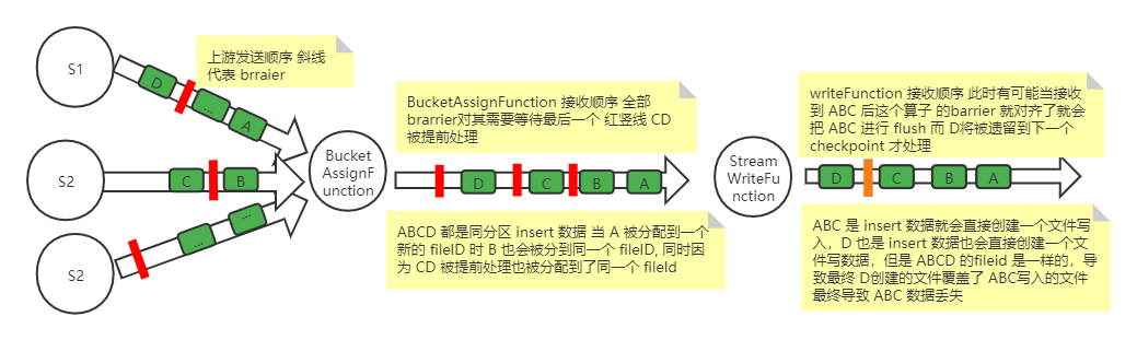 writeFunction 有可能当接收到 A、B、C 后这个算子的 barrier 就对齐了,会把 A、B、C 进行 flush,而 D 将被遗留到下一个 checkpoint 才处理。A、B、C 是 insert 数据所以就会直接创建一个文件写入,D 属于下一个 checkpoint ,A、B、C 写入时创建的 handle 已被清理了,等到下一个 checkpoint 执行 flush。因为 D 也是 insert 数据所以也会直接创建一个文件写数据,但是 A、B、C、D 的 fileld 是一样的,导致最终 D 创建的文件覆盖了 A、B、C 写入的文件最终导致 A、B、C 数据丢失。
