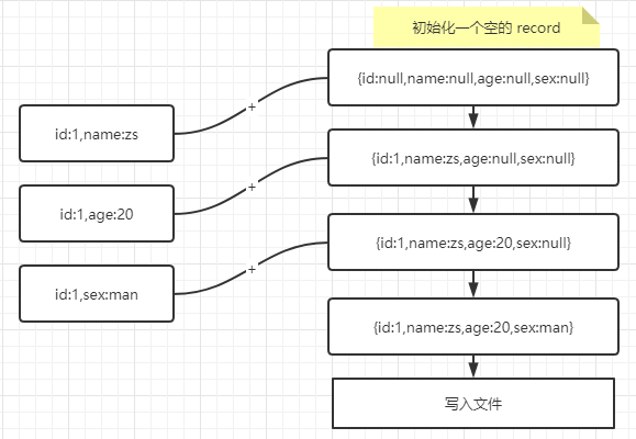 对于 StreamWriteFunction 在 Insert 场景中,假如收到了如下 3 条数据 {id:1,name:zs},{id:1,age:20},{id:1,sex:man},在执行 flush 时会创建一个全字段的空记录 {id:null,name:null,age:null,sex:null},然后依次和 3 条记录进行合并。注意,这个合并过程只会选择有效字段的合并。如下图: