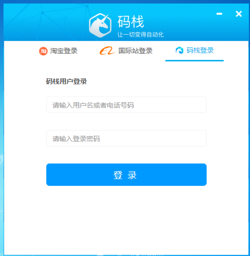 目前支持3种账号的登录,淘宝账号,阿里巴巴国际站账号,和码栈注册的账号,暂时码栈账号暂停了注册,大家可以直接使用淘宝的账号登录,支持子账号登录。