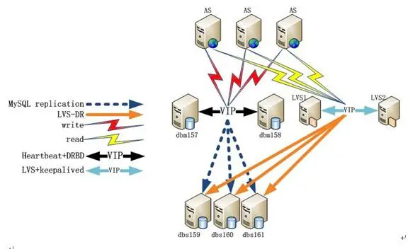最后,mysql主的从节点dbs159/160/161通过mysql主从复制功能同步mysql主的数据,通过lvs功能提供给前端AS应用进行读操作,并实现负载均衡。