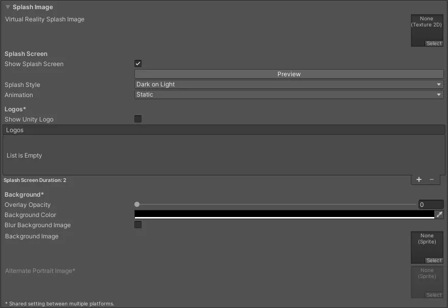 - Preview: 使用 Preview 按钮可在 Game 视图中查看启动画面的预览