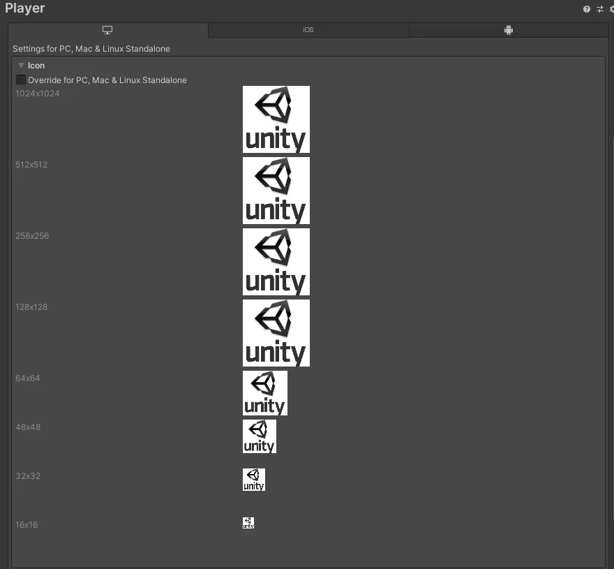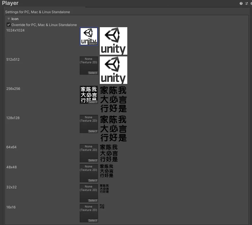 勾选Override for PC,Mac && Linux Standalone,可以上传不同大小的图标来填充提供的每个方块,下面的大尺寸选择图之后,会向下兼容小尺寸: