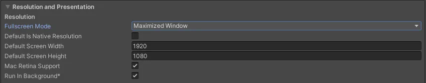 - Default Is Native Resolution: 启用此选项可使游戏使用目标机器上使用的默认分辨率。【Fullscreen Mode 选 Maximized Window 可用】