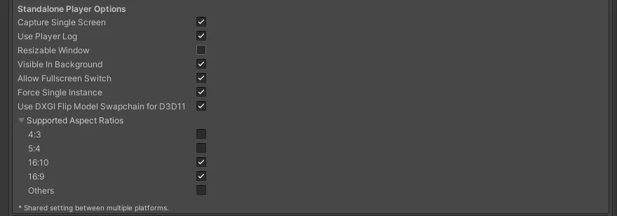 - Supported Aspect Ratios: 启用希望游戏启动时出现在分辨率对话框中的每个宽高比。【启用Display Resolution Dialog时生效】