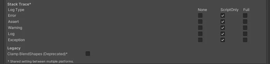 选中运行脚本时 (ScriptOnly)、始终 (Full) 或从不 (None) 条件下对应于每个 Log Type(Error、Assert、Warning、Log 和 Exception)的复选框。