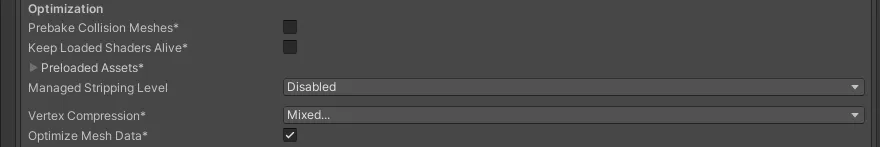 - Optimize Mesh Data:启用此选项可从网格中删除应用于网格的材质不需要的所有数据(例如切线、法线、颜色和 UV)。