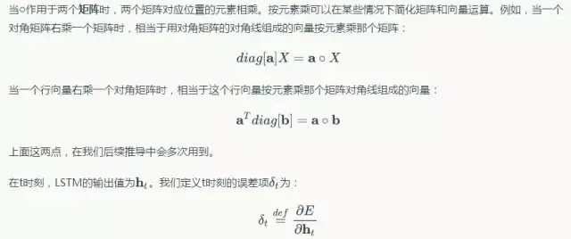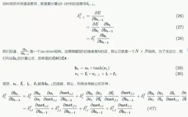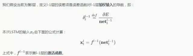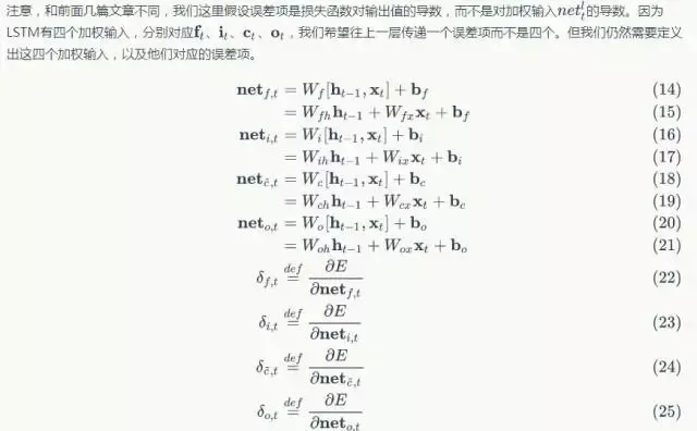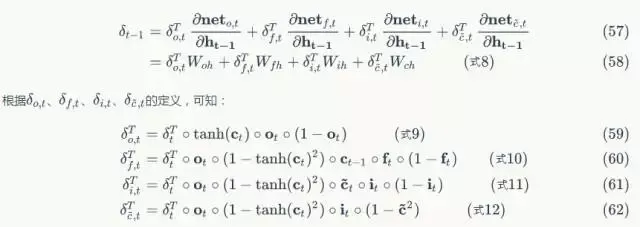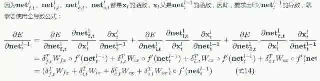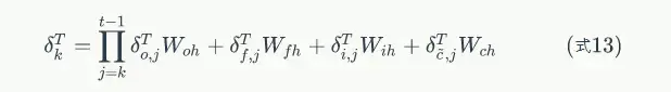式8到式12就是将误差沿时间反向传播一个时刻的公式。有了它,我们可以写出将误差项向前传递到任意k时刻的公式: