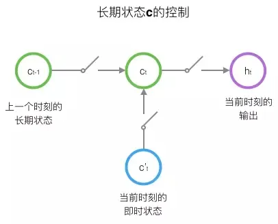 LSTM的关键,就是怎样控制长期状态c。在这里,LSTM的思路是使用三个控制开关。第一个开关,负责控制继续保存长期状态c;第二个开关,负责控制把即时状态输入到长期状态c;第三个开关,负责控制是否把长期状态c作为当前的LSTM的输出。三个开关的作用如下图所示: