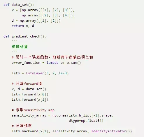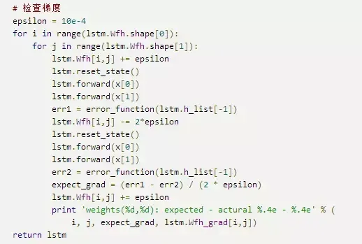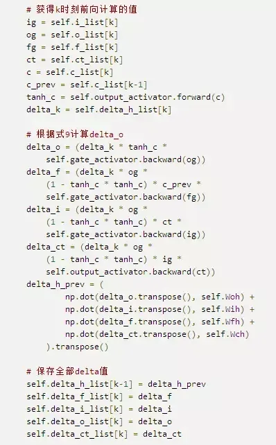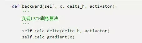 backward方法实现了LSTM的反向传播算法。需要注意的是,与backword相关的内部状态变量是在调用backward方法之后才初始化的。这种延迟初始化的一个好处是,如果LSTM只是用来推理,那么就不需要初始化这些变量,节省了很多内存。