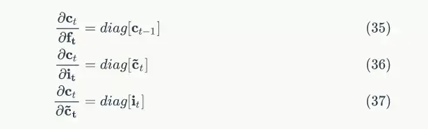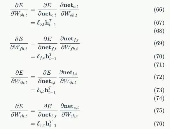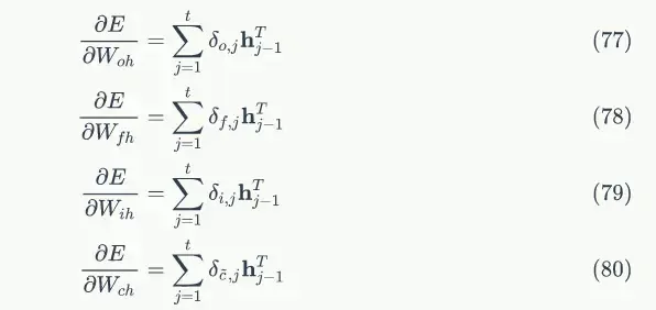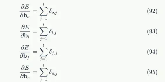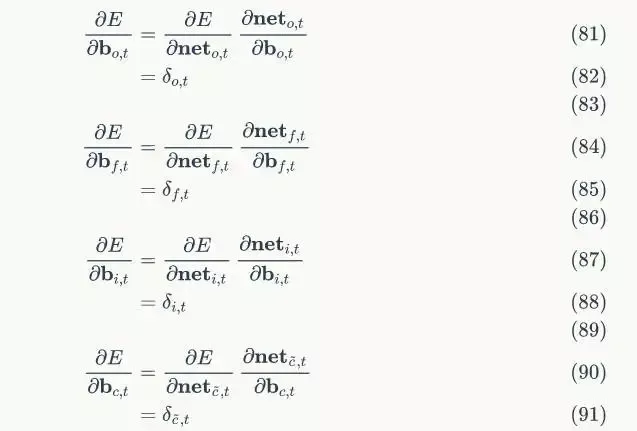 的梯度,也是将各个时刻的梯度加在一起。下面是各个时刻的偏置项梯度: