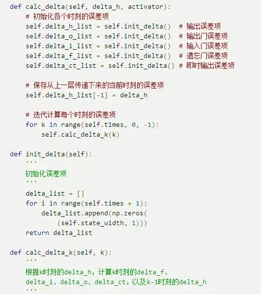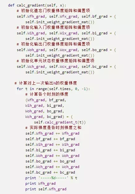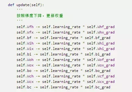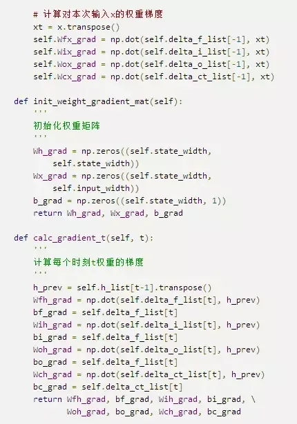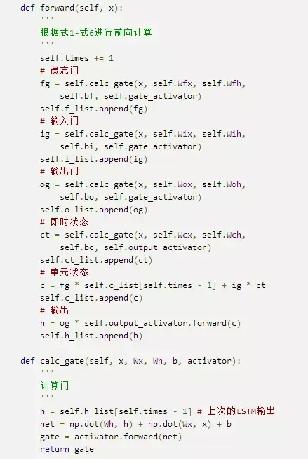 从上面的代码我们可以看到,门的计算都是相同的算法,而门和的计算仅仅是激活函数不同。因此我们提出了calc_gate方法,这样减少了很多重复代码。